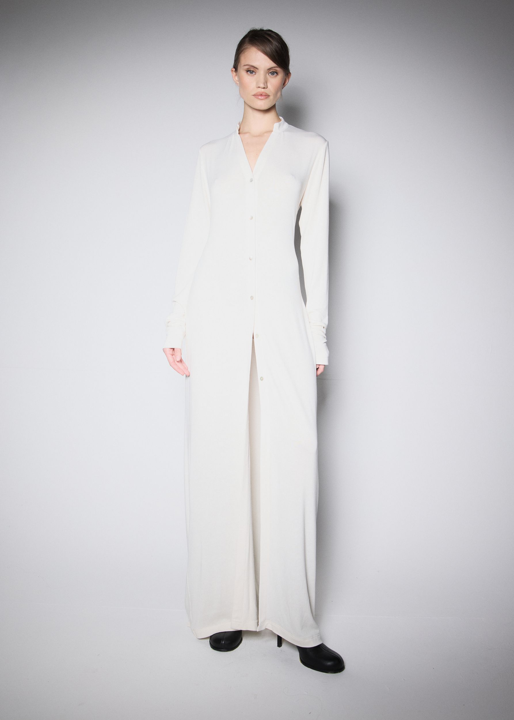 Kalhoty mají pohodlný elastický pas, top je doplněn o výrazná vsazená ramena a kardigan je zapínaný na řadu jemných knoflíků a má dlouhé rukávy. Kardigan lze také nosit jako šaty. Celek tvoří moderní a zároveň pohodlný základ šatníku, který se snadno kombinuje pro každý den.