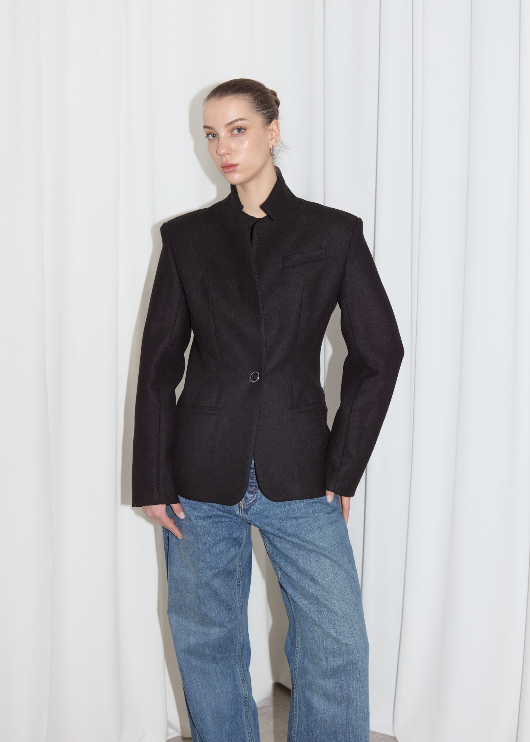 Černé vypasované sako z vlny. Hřejivé a nadčasové. Klasický siluet, lehce prodloužený střih a stojaté klopy dodávají charakter. Vyrobeno ve velikostech S a M. Modelka měři 177 a má oblečené naše džíny vel.28 a tričko z Basic kolekce.
