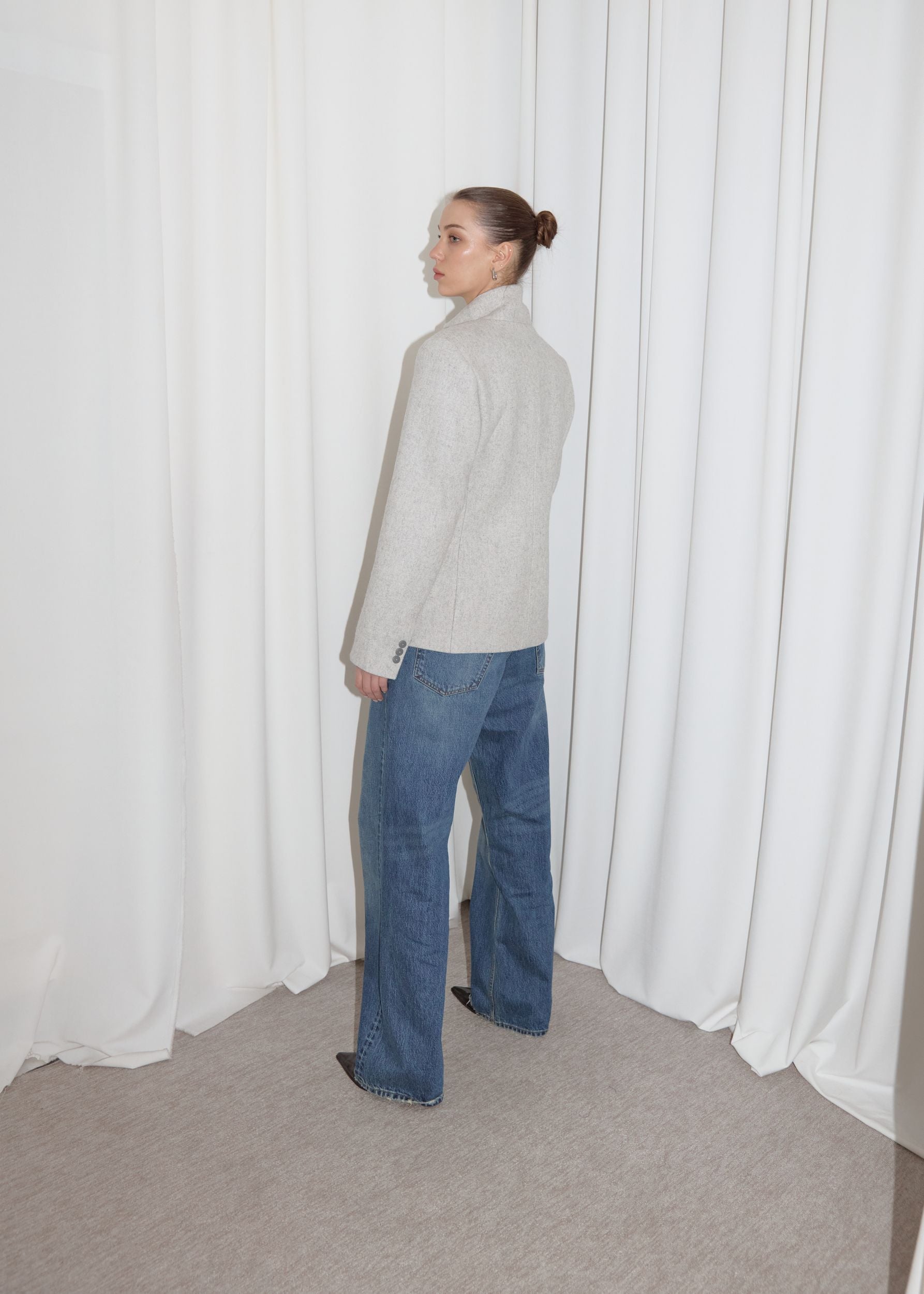 Šedé vypasované sako z vlny. Hřejivé a nadčasové. Klasický siluet, lehce prodloužený střih a stojaté klopy dodávají charakter. Vyrobeno v jediném kusu ve velikosti S. Modelka měři 177 a má oblečené naše džíny vel.28 a tričko z Basic kolekce.